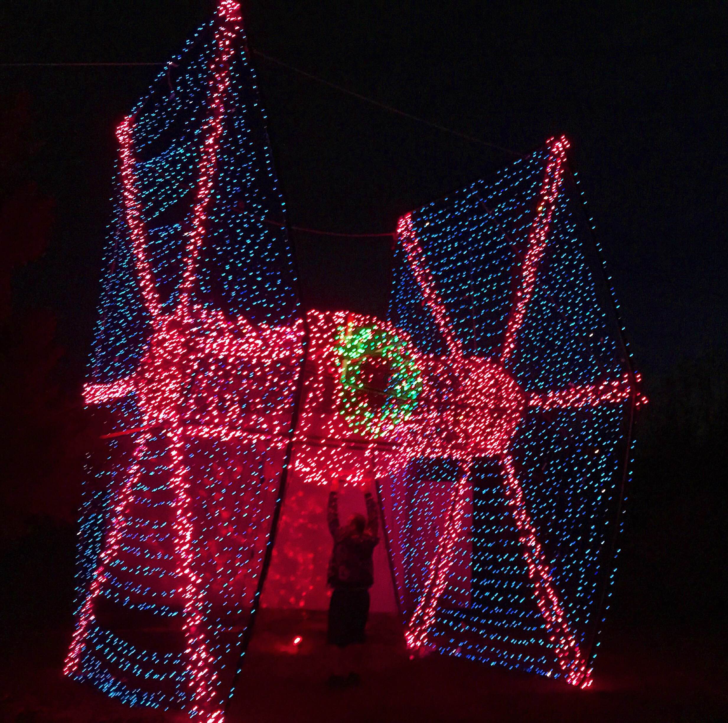 Maxwell DeLorm of Munnsville, New York, decided to decorate his house with something other than jolly Santas this year. Instead, he and his friends constructed one of the spaceships from the Star Wars films. His red TIE Fighter was built out of 10,300 Christmas lights and lots of PVC pipe. Each wing is over 20 feet tall and 14 feet wide. Putting it together required over a month of labor and about $3,400 worth of supplies. (Click on the pictures below to enlarge them.)