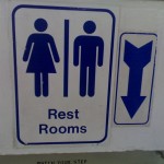 Yet again in June, a man in a Dallas, Texas, Wal-Mart called police to report that a man in the stall next to him had reached his hand under the stalll divider…and snapped a photo of him with his cell phone. Police said surveillance video showed the man leaving the store in a blue Mustang convertible, and that anyone seeing such a vehicle…should avoid going to the restroom with whoever was driving it. (Photo of bathroom sign with arrow showing where you to put cell phone camera found somewhere on the internet.)