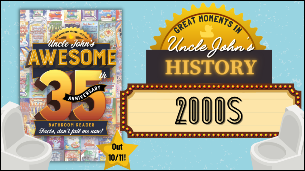 We’re keeping the party going for Uncle John’s birthday—and the brand-new Uncle John’s Awesome 35th Anniversary Bathroom Reader—with more fun facts from the 2000s Facts, don’t fail us now!