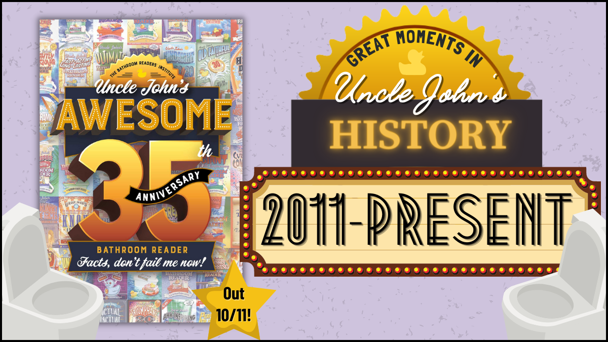 Uncle John’s Awesome 35th Anniversary Bathroom Reader is on bookshelves today! We're bringing it home for this auspicious book birthday with fun facts from 2011-present. Facts, don’t fail us now!